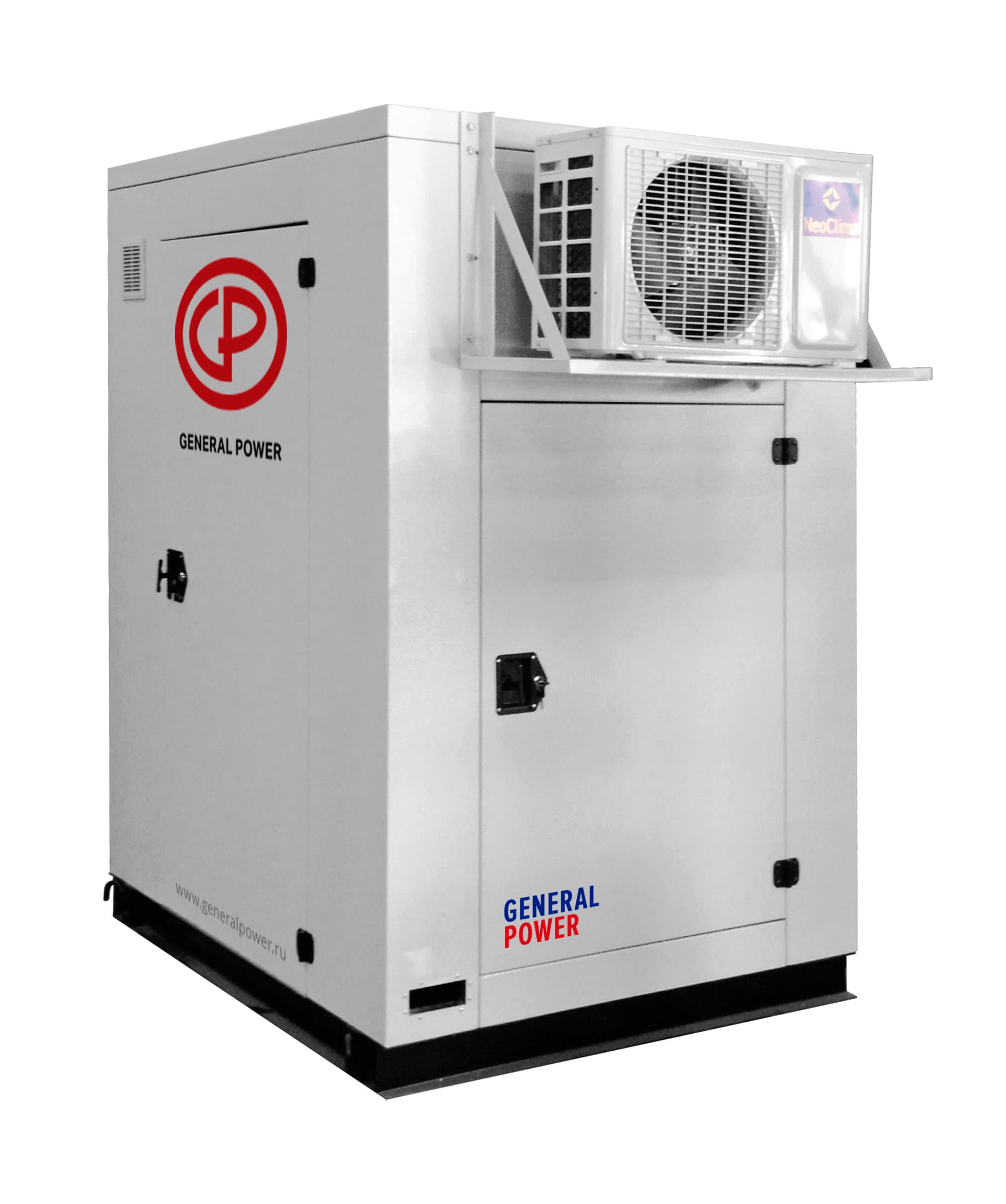Универсальный специализированный контейнер уличного исполнения для ИБП мощностью до 20 кВА с системой кондиционирования и возможностью 4-х стороннего доступа к ИБП.