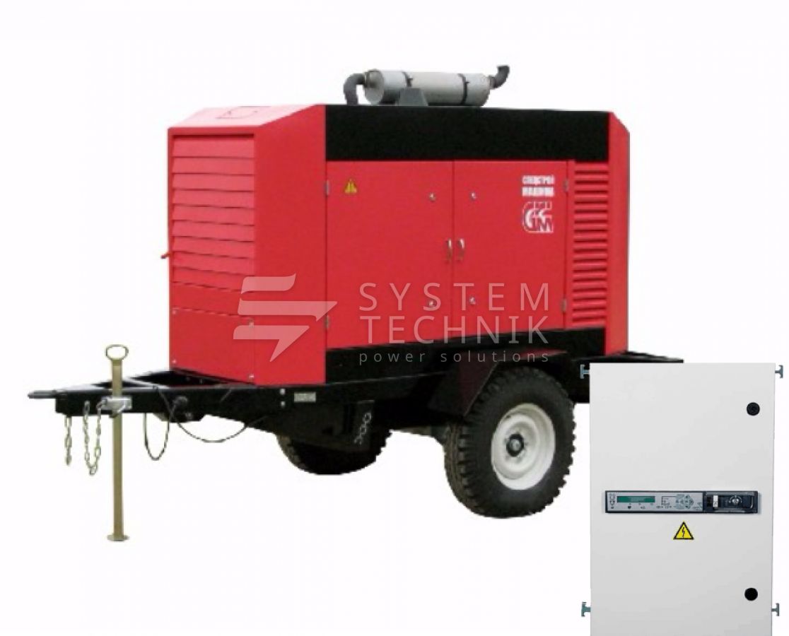 - ССМ ЭД-30-Т400-2РПМ1 в погодозащитном кожухе на шасси с АВР на прицепе